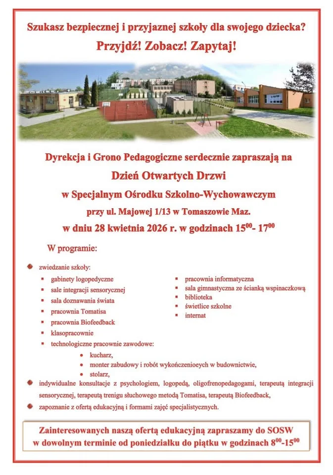 W Tomaszowie Mazowieckim szykuje się ciekawy dzień dla rodziców, którzy szukają dla swojego dziecka miejsca z przyjazną atmosferą i indywidualnym podejściem. Dni Otwarte w Specjalnym Ośrodku Szkolno-Wychowawczym to dobra okazja, żeby spokojnie rozejrzeć się po szkole, porozmawiać ze specjalistami i zobaczyć, jak wygląda nauka na co dzień. Warto wpaść i przekonać się na własne oczy, jak wygląda to miejsce.